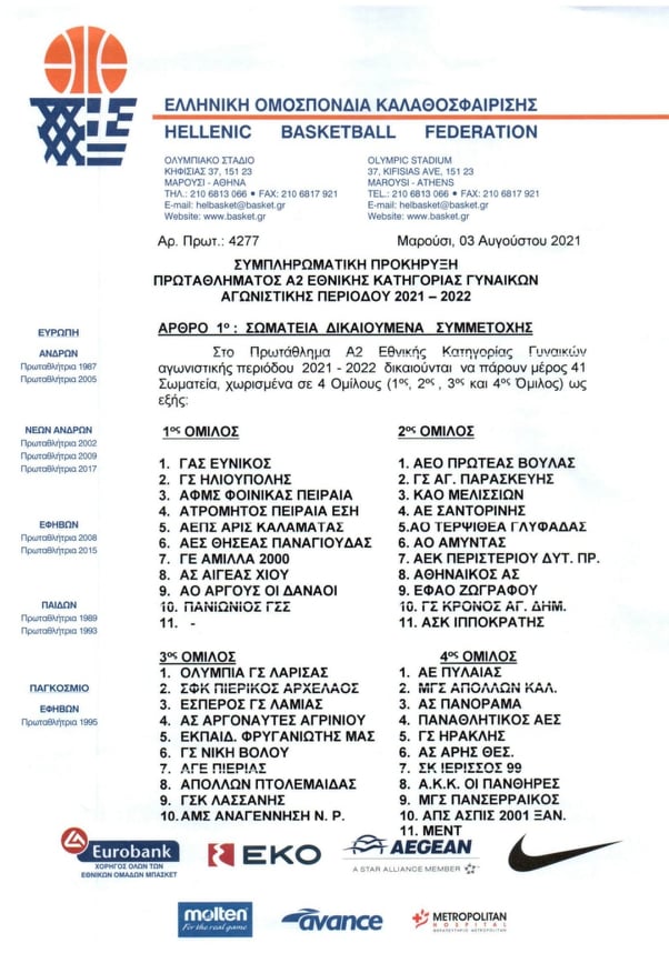 Σε τέσσερις ομίλους θα διεξαχθεί και τη νέα σεζόν (2021-2022) το πρωτάθλημα της Α2 Γυναικών, όπως γνωστοποίησε η Ομοσπονδία μετά την σχετική προκήρυξη.