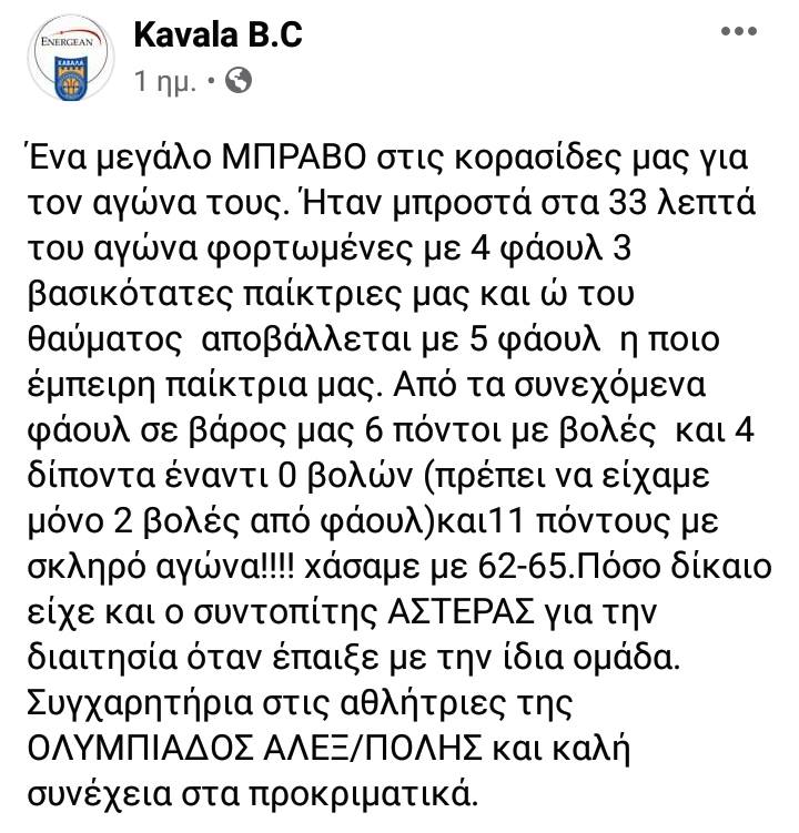 «Ένα μεγάλο ΜΠΡΑΒΟ στις κορασίδες μας για τον αγώνα τους. Ήταν μπροστά στα 33 λεπτά του αγώνα φορτωμένες με 4 φάουλ 3 βασικότατες παίκτριες μας και ώ του θαύματος αποβάλλεται με 5 φάουλ η ποιο έμπειρη παίκτρια μας. Από τα συνεχόμενα φάουλ σε βάρος μας 6 πόντοι με βολές και 4 δίποντα έναντι 0 βολών (πρέπει να είχαμε μόνο 2 βολές από φάουλ) και 11 πόντους με σκληρό αγώνα!!!! xάσαμε με 62-65. Πόσο δίκαιο είχε και ο συντοπίτης ΑΣΤΕΡΑΣ για την διαιτησία όταν έπαιξε με την ίδια ομάδα. Συγχαρητήρια στις αθλήτριες της ΟΛΥΜΠΙΑΔΟΣ ΑΛΕΞ/ΠΟΛΗΣ και καλή συνέχεια στα προκριματικά.»