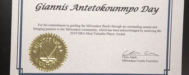 It’s official. Today is @Giannis_An34 Day throughout Milwaukee County @Bucks. pic.twitter.com/ygnjBFR1az