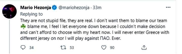 Με μήνυμά του στο twitter ο Μάριο Χεζόνια, ο οποίος σύμφωνα με πληροφορίες από την Κροατία φέρεται να οδεύει προς την Ούνικς Καζάν, ζήτησε από τους φίλους του Παναθηναϊκού να μην κατηγορήσουν τους «πράσινους» για το γεγονός ότι δε θα συνεχίσει στην ομάδα.