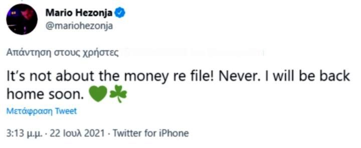 Λίγο αργότερα μάλιστα ο Χεζόνια έγραψε ξανά στο twitter: «Είμαι κάτι περισσότερο από απογοητευμένος και συντετριμμένος» ενώ σε άλλο σχόλιο φίλου του τριφυλλιού απάντησε πως «δεν είναι οικονομικό το θέμα ρε φίλε, ποτέ! Θα επιστρέψω σπίτι σύντομα».