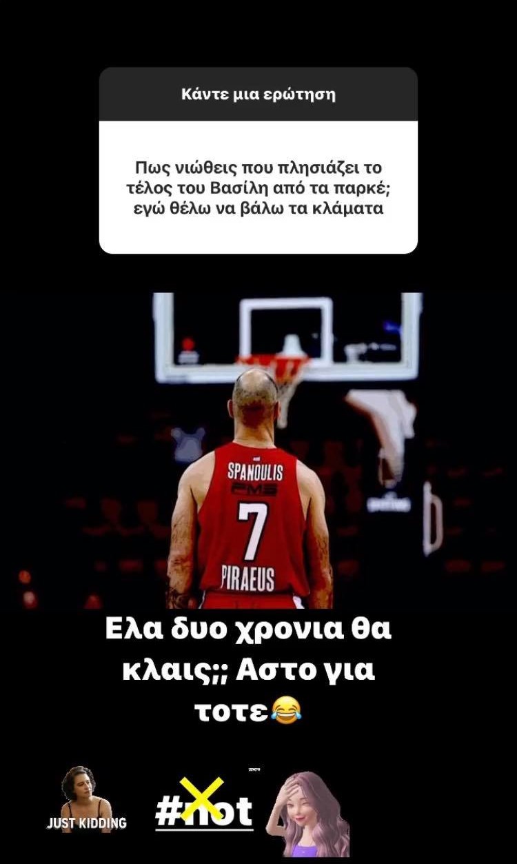 Η σύζυγος Βασίλη Σπανούλη, Ολυμπία Χοψονίδου, όταν ρωτήθηκε στο πλαίσιο Q and A, από follower της για το πώς νιώθει που πλησιάζει το τέλος του Σπανούλη από τα παρκέ, απάντησε ότι ο αρχηγός του Ολυμπιακού ότι έχει ακόμη δύο χρόνια.