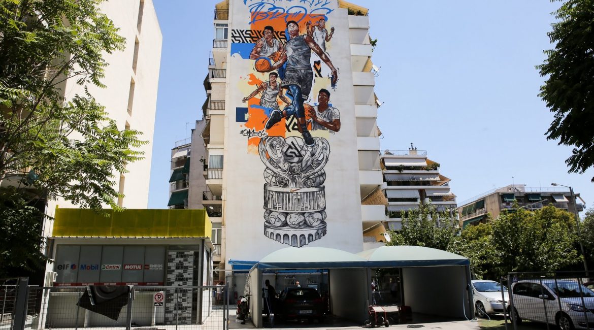 Δίπλα από το γήπεδο μπάσκετ όπου δεσπόζει η φιγούρα του Γιάννη Αντετοκούνμπο, επί της οδού Δυρραχίου, δημιουργήθηκε ένα νέο εντυπωσιακό γκράφιτι.
