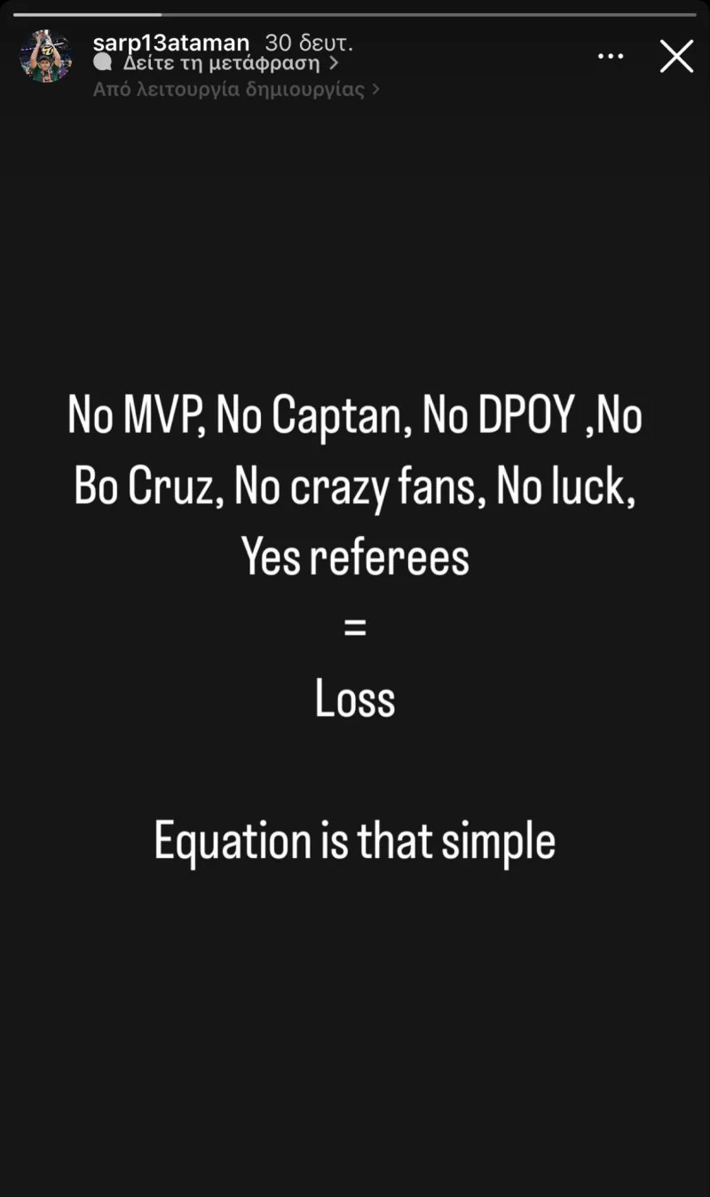 «Χωρίς MVP, χωρίς αρχηγό, χωρίς Bo Cruz, χωρίς τρελούς οπαδούς, χωρίς τύχη και με… διαιτητές=ήττα, η εξίσωση είναι τόσο απλή» έγραψε στην ανάρτησή του.
