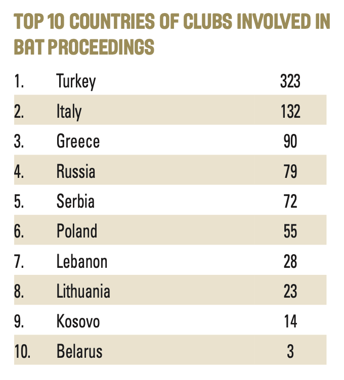 Η FIBA έδωσε στη δημοσιότητα το Top-10 των χωρών με τις περισσότερες υποθέσεις που έφτασαν στο BAT, το δικαστικό δηλαδή όργανο επίλυσης οικονομικών διαφορών ανάμεσα σε ομάδες, παίκτες, προπονητές και μάνατζερ.