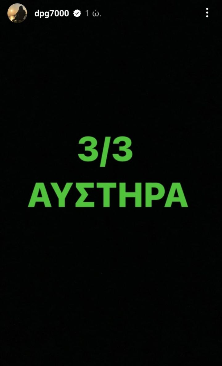 Ο Δημήτρης Γιαννακόπουλος, με instagram story ύστερα από το φινάλε του αγώνα, έστειλε μήνυμα λέγοντας «3/3 αυστηρά», ζητώντας νίκες με Βίρτους Μπολόνια, Μπάγερν Μονάχου και Άλμπα Βερολίνου.
