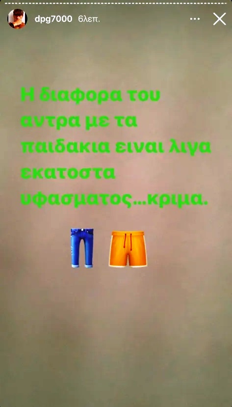 Συγκεκριμένα, ο μεγαλομέτοχος της ΚΑΕ Παναθηναϊκός δημοσίευσε δύο emojis με ένα παντελόνι και ένα σορτσάκι, γράφοντας χαρακτηριστικά: «Η διαφορά του άντρα με τα παιδάκια είναι λίγα εκατοστά ύφασμα. Κρίμα».