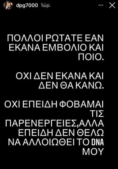 «Πολλοί ρωτάτε αν έκανα εμβόλιο και ποιο. Όχι δεν έκανα και δεν θα κάνω. Όχι επειδή φοβάμαι τις παρενέργειες, αλλά επειδή δεν θέλω να αλλοιωθεί το DNA μου» έγραψε χαρακτηριστικά στο story του ο μεγαλομέτοχος της ΚΑΕ Παναθηναϊκός.