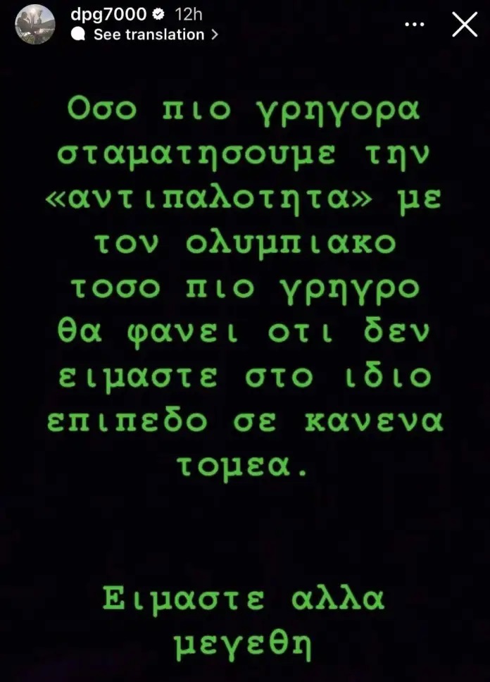 Ο Δημήτρης Γιαννακόπουλος σε ανάρτησή του σε instagram story σχολίασε με νόημα πως μόνο όταν σταματήσει η «αντιπαλότητα» του Παναθηναϊκού με τον Ολυμπιακό θα φανεί η διαφορά επιπέδου των δύο ομάδων, αφού σύμφωνα με τον ίδιο είναι «άλλα μεγέθη».