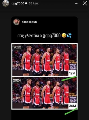 Συγκεκριμένα, ο ιδιοκτήτης της ΚΑΕ Παναθηναϊκός αναδημοσίευσε story με δύο φωτογραφίες της πεντάδας των Πειραιωτών του 2022 και του 2024 που είναι ίδιες ως προς το αγωνιστικό μέρος (Ουόκαπ, Ντόρσεϊ, Παπανικολάου, Βεζένκοφ και Φαλ), αλλά διαφέρουν πολύ στο οικονομικό κομμάτι και υπάρχει η λεζάντα «σας γλεντάει ο dpg700».