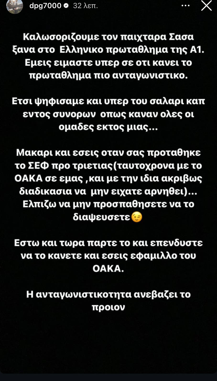 «Καλωσορίζουμε τον παικταρά Σάσα ξανά στο Ελληνικό πρωτάθλημα της Α1. Εμείς είμαστε υπέρ σε ότι κανει το πρωτάθλημα πιο ανταγωνιστικό. Έτσι ψηφίσαμε και υπέρ του σάλαρι καπ εντός συνόρων όπως κάναν όλες οι ομάδες εκτός μίας…» και συνέχισε: