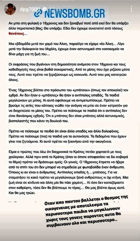 «Όταν από παντού βάλλεται ο θεσμός της οικογένειας με αποτέλεσμα τα περισσότερα παιδιά να μεγαλώνουν χωρίς τους γονείς παρόντες, αυτά θα συμβαίνουν όλο και περισσότερο» έγραψε χαρακτηριστικά ο μεγαλομέτοχος της ΚΑΕ Παναθηναϊκός.
