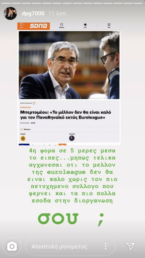 «4η φορά σε 5 μέρες μέσα το είπες… Μήπως τελικά αγχώνεσαι ότι το μέλλον της Euroleague δεν θα είναι καλό χωρίς τον πιο πετυχημένο σύλλογο που φέρνει και τα πιο πολλά έσοδα στη διοργάνωσή σου;» έγραψε χαρακτηριστικά ο διοικητικός ηγέτης της «πράσινης» ΚΑΕ.