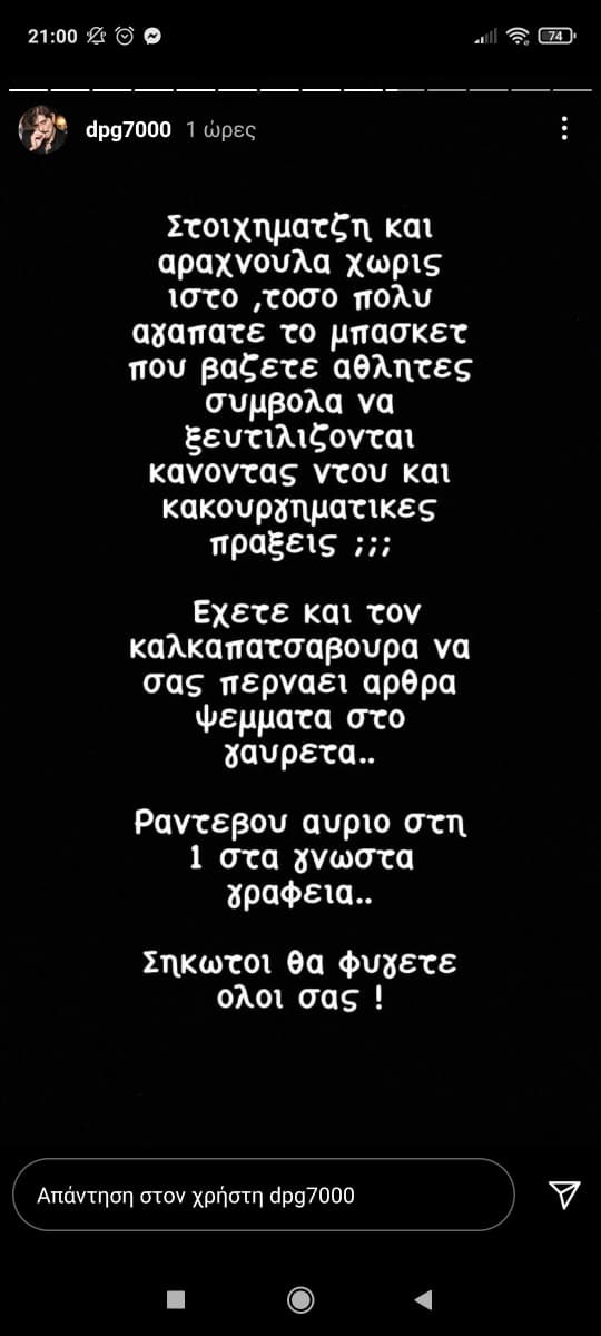 «Στοιχηματζή και αραχνούλα χωρίς ιστό, τόσο πολύ αγαπάτε το μπάσκετ που βάζετε αθλητές – σύμβολα να ξεφτιλίζονται κάνοντας ντου και κακουργηματικές πράξεις; (…) Ραντεβού αύριο στη 1 στα γνωστά γραφεία… Σηκωτοί θα φύγετε όλοι σας!» έγραψε, μεταξύ άλλων, στα social media o DPG.