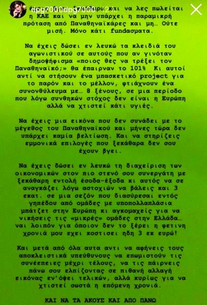 Για τις ραγδαίες εξελίξεις στον Παναθηναϊκό πήρε θέση ο ιδιοκτήτης της ομάδας, Δημήτρης Γιαννακόπουλος, ο οποίος έκανε ένα story που ανέφερε ουσιαστικά τους λόγους των αποφάσεων, λέγοντας μεταξύ άλλων πως οι υπεύθυνοι του αγωνιστικού σχεδιασμού δημιούργησαν έναν συνονθύλευμα με 8 ξένους και πως η εικόνα δεν συνάδει με το μέγεθος του Παναθηναϊκού.