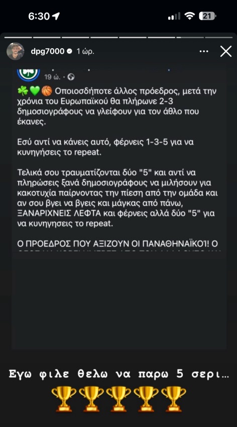 Ο Δημήτρης Γιαννακόπουλος αναδημοσίευσε ανάρτηση που τον εξυμνεί για τη νοοτροπία νικητή που διαθέτει και τη διαρκή επένδυσή του, ώστε ο Παναθηναϊκός να διεκδικεί την κορυφή, αντί να κρύβεται πίσω από δικαιολογίες για ατυχίες και τραυματισμούς.