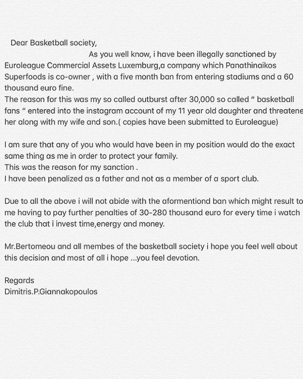 «Όπως όλοι γνωρίζετε, έχω τιμωρηθεί παράνομα από την Ευρωλίγκα, μία εταιρία όπου ο Παναθηναϊκός Superfoods βρίσκεται ανάμεσα στους ιδιοκτήτες, με πεντάμηνη απαγόρευση εισόδου στα γήπεδα και 60.000 ευρώ πρόστιμο.