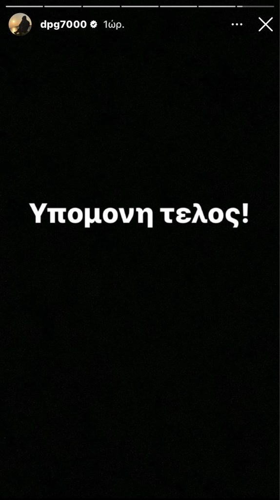 Αινιγματικό story δημοσίευσε ο Δημήτρης Γιαννακόπουλος, ο οποίος ανέβασε ένα story στο Instagram με το μήνυμα «Υπομονή τέλος», χωρίς πάντως να αναφέρεται σε τι ή ποιον αναφέρεται.