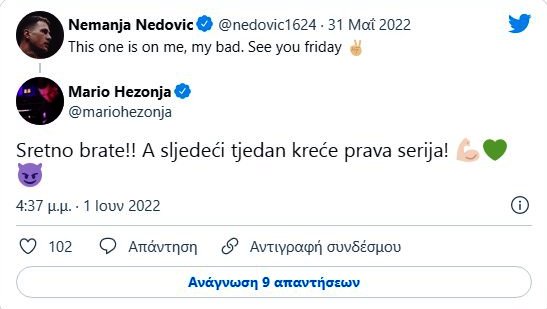 Από την πλευρά του, ο Μάριο Χεζόνια απάντησε μέσω twitter στον Σέρβο γκαρντ των «πρασίνων», στηρίζοντάς τον δημόσια.
