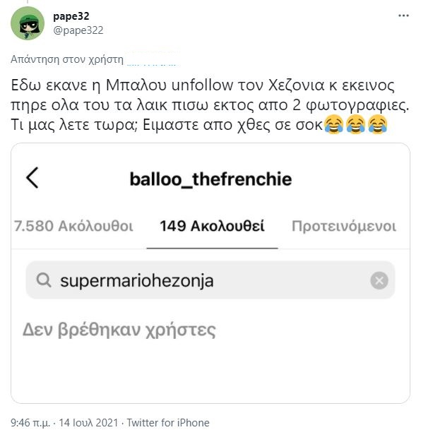 Όχι, πάντως, από τον δικό της λογαριασμό, αφού δεν τον είχε ακολουθήσει ποτέ, αλλά από τον λογαριασμό της σκυλίτσας της, της Μπαλού!