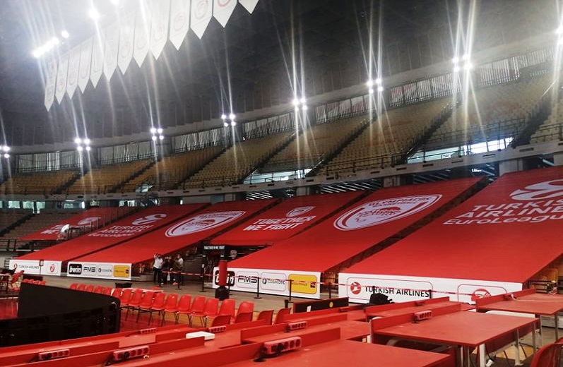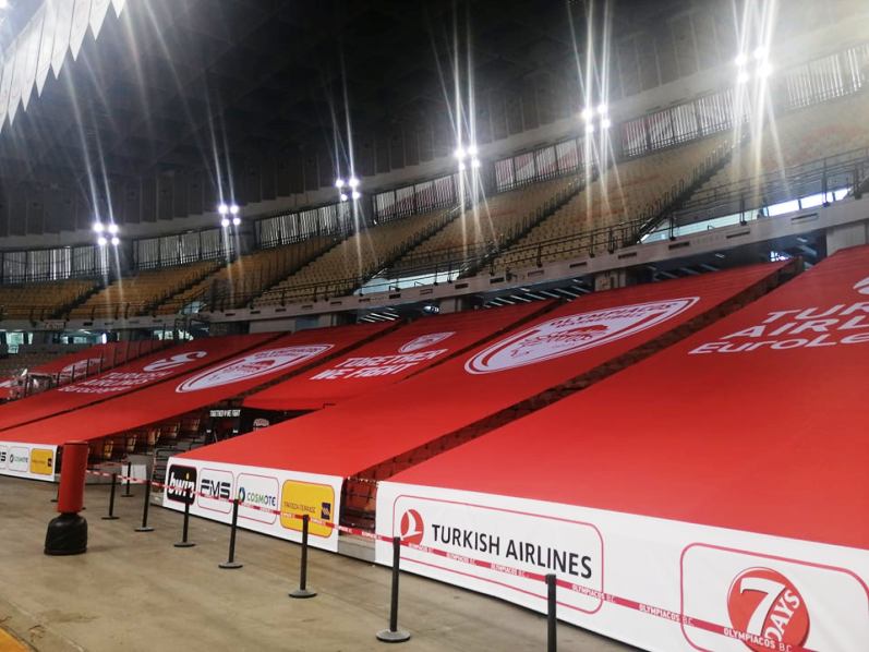 Συγκεκριμένα, η ομάδα του Πειραιά κάλυψε τα άδεια καθίσματα με μεγάλα πανό, που έχουν πάνω τους το σήμα του Ολυμπιακού, αλλά και της Euroleague.