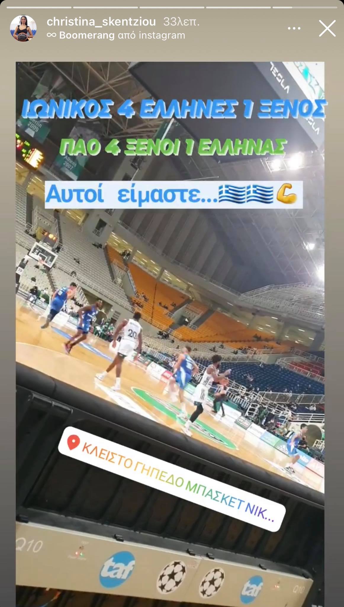 Η πρόεδρος του Ιωνικού, Χριστίνα Σκέντζιου, έριξε «σπόντα» έριξε μέσω Instagram κατά τη διάρκεια του αγώνα του Ιωνικού στο ΟΑΚΑ με τον Παναθηναϊκού με αφορμή την παρουσία πολλών ξένων στην πεντάδα του Παναθηναϊκού.
