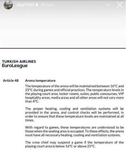 Ο Δημήτρης Γιαννακόπουλος αναφέρθηκε στον κανονισμό της Euroleague για τη διεξαγωγή αγώνων και ξεκαθαρίζει πως οι διαιτητές μπορούν να διακόψουν ένα παιχνίδι αν η θερμοκρασία δε βρίσκεται εντός των επιθυνητών ορίων.