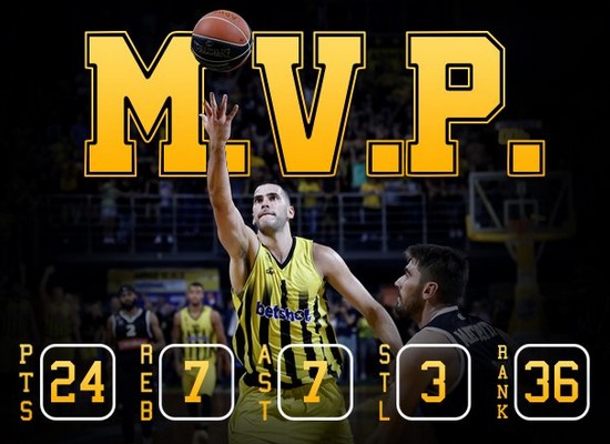 Ο 25χρονος αρχηγός των «κίτρινων» συγκέντρωσε 36 βαθμούς στο ράνκινγκ (24 πόντοι με 8/11 βολές, 5/10 δίποντα, 2/3 τρίποντα, 7 ριμπάουντ, 7 ασίστ, ένα κόψιμο, 2 κοψίματα εναντίον, 9 κερδισμένα φάουλ, 2 φάουλ εναντίον, 3 κλεψίματα, δύο λάθη σε 36’ και 51’’ συμμετοχής), περισσότερους από κάθε άλλο παίκτη στην πρεμιέρα της Basket League