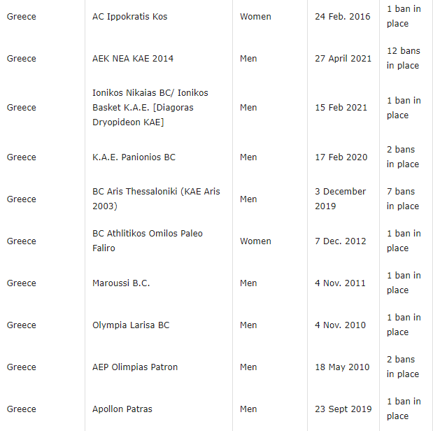 Την ίδια στιγμή, ο Άρης έχει επτά ban, ενώ ακόμα εννέα ελληνικές ομάδες έχουν δεχθεί τουλάχιστον από ένα ban.