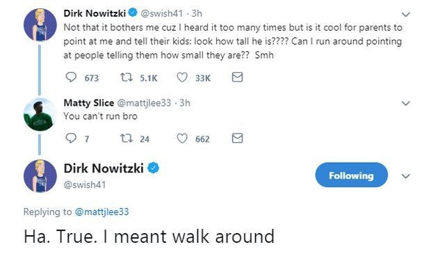 Ο Ντιρκ Νοβίτσκι συνηθίζει να «ζωγραφίζει» στα social media και αυτή τη φορά φρόντισε να δώσει ρεσιτάλ αυτοσαρκασμού όταν ένας ακόλουθός του στο twitter του είπε ότι δεν μπορεί να τρέξει με τον σταρ των Μάβερικς να δίνει επική απάντηση!