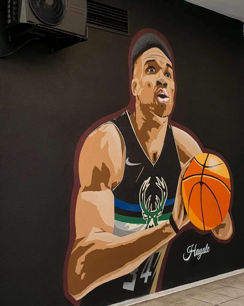 Ο Γιάννης Αντετοκούνμπο απέκτησε το δικό του γκράφιτι στην Καλαμαριά από τον άνθρωπο (Ηλίας Στύλος, γνωστός και ως Hayate) που είχε δημιουργήσει επίσης τις μορφές του Ντιέγκο Αρμάντο Μαραντόνα και του Βασίλη Χατζηπαναγή.