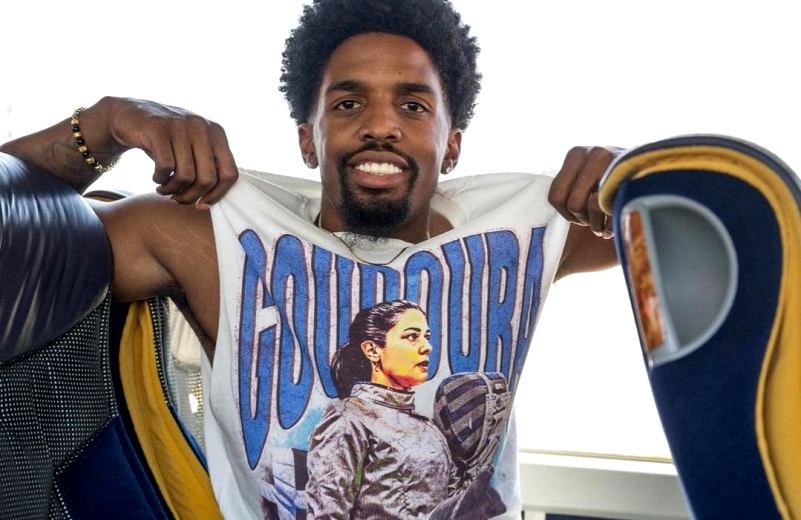 Ο Αμερικανός άσος του Ολυμπιακού φόρεσε μία σειρά από ιδιαίτερες μπλούζες που ετοίμασε ειδικά για την περίστασηκι μεταξύ των οποίων και μία με το πρόσωπο της Δώρας Γκουντούρα, της πρωταθλήτριας της ξιφασκίας που αδικήθηκε στους Ολυμπιακούς Αγώνες του Παρισιού, ένα βήμα πριν την πρόκρισή της στα ημιτελικά.
