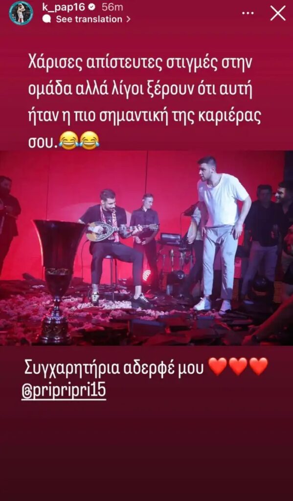 «Χάρισες απίστευτες στιγμές στην ομάδα, αλλά λίγοι ξέρουν ότι αυτή ήταν η πιο σημαντική της καριέρας σου. Συγχαρητήρια αδερφέ μου» έγραψε ο αρχηγός του Ολυμπιακού.