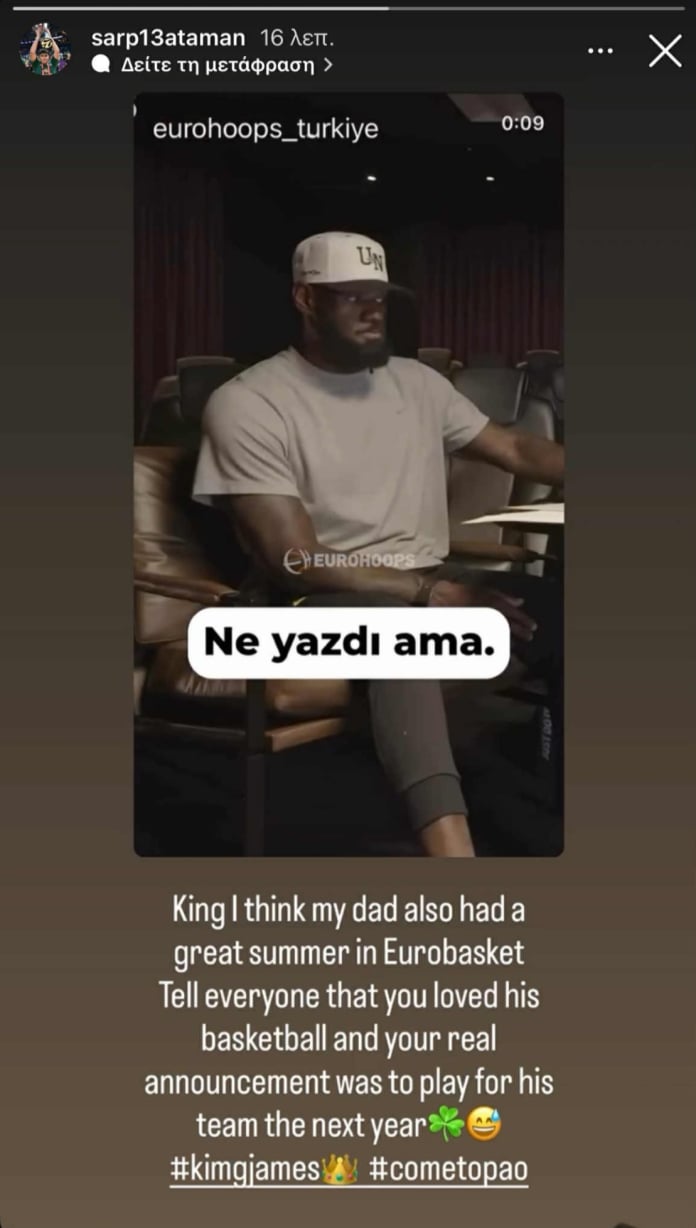 Ο Σαρπ Αταμάν με μία μάλλον χιουμοριστική ανάρτηση στον λογαριασμό του στο Instagram, έστειλε ένα μήνυμα στον ΛεΜπρόν Τζέιμς, ζητώντας του να παραδεχτεί το γεγονός ότι λατρεύει το μπάσκετ που παίζει ο πατέρας του και να αποκαλύψει ότι επιθυμεί να αγωνιστεί στον Παναθηναϊκό, ωστόσο δύσκολα θα πάρει την απάντηση που επιθυμεί.