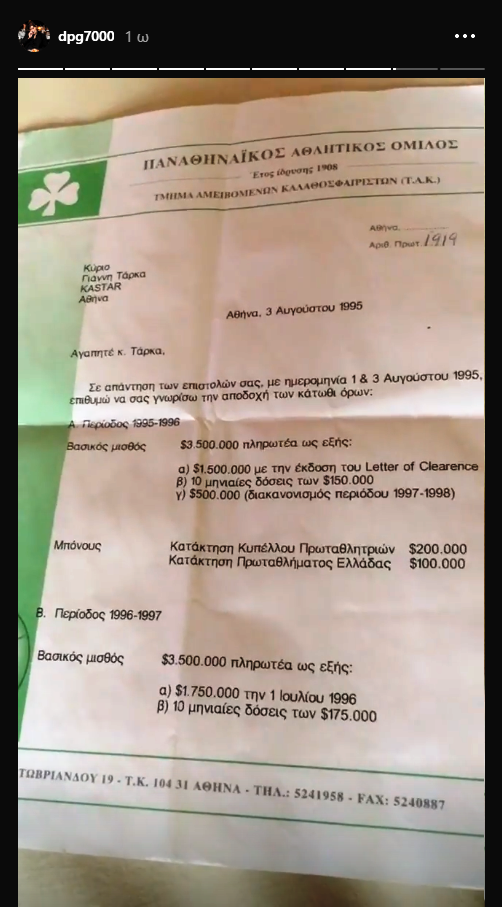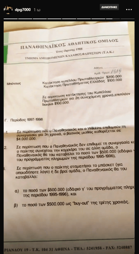 Ο ισχυρός άνδρας της πράσινης ΚΑΕ ανέβασε στόρι στο instagram με το μυθικό συμβόλαιο του μεγαλύτερου Αμερικανού που αγωνίστηκε ποτέ στην Ευρώπη, ο οποίος είχε 3,5 εκατομμύρια δολάρια ως βασικό μισθό, και μπόνους που προέβλεπαν άλλες 300 χιλιάδες!