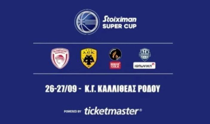 Για τους αγώνες που θα διεξαχθούν στο κλειστό της Καλλιθέας στη Ρόδο, την Παρασκευή 26/9 και το Σάββατο 27/9, με τη συμμετοχή του Ολυμπιακού, της ΑΕΚ, του Προμηθέα ΒΙΚΟΣ COLA και της Καρδίτσας ΙΑΠΩΝΙΚΗ στο πλαίσιο του Stoiximan Super Cup ενημερώνουμε τους φιλάθλους που θέλουν να τους παρακολουθήσουν από κοντά ότι: Εισιτήρια θα διατεθούν ΜΟΝΟ διαδικτυακά (ticketmaster).