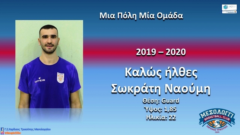 Ο Γ.Σ.Χαρίλαος Τρικούπης Μεσολογγίου είναι στην ευχάριστη θέση να ανακοινώσει την έναρξη συνεργασίας του με το καλαθοσφαιριστή Σωκράτη Ναούμη για την αγωνιστική περίοδο 2019-2020.