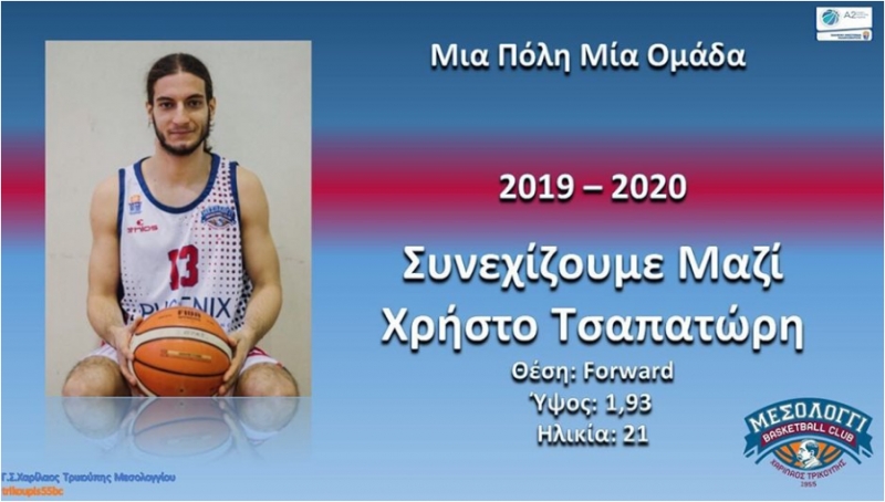 “Το Διοικητικό Συμβούλιο του Συλλόγου μας είναι στην ευχάριστη θέση να ανακοινώσει ότι ο Μεσολογγίτης καλαθοσφαιριστής Χρήστος Τσαπατώρης θα φορά τη φανέλα της ομάδας μας και τη φετινή αγωνιστική περίοδο.