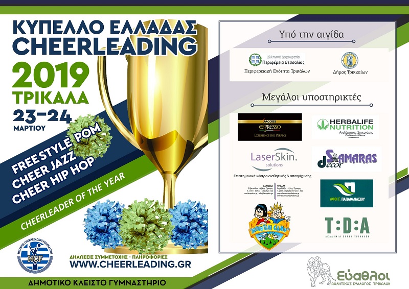 Σε αγωνιστικούς ρυθμούς βρίσκεται η πόλη των Τρικάλων εν όψη του 2ου Κυπέλλου Ελλάδας στο άθλημα του Cheerleading που θα πραγματοποιηθεί στο Δημοτικό Κλειστό Γυμναστήριο της οδού Κατσιμήδου το Σαββατοκύριακο 23 και 24 Μαρτίου 2019.