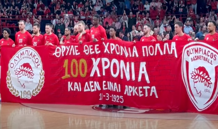 «Θρύλε θεέ χρόνια πολλά, 100 χρόνια και δεν είναι αρκετά» αναγραφόταν στο πανό που φέρει την υπογραφή των παικτών του Ολυμπιακού.