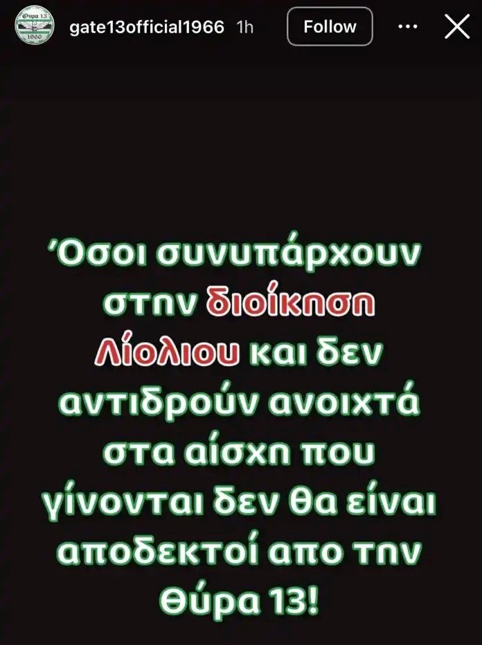 «Όσοι συνυπάρχουν στη διοίκηση Λιόλιου και δεν αντιδρούν ανοιχτά στα αίσχη που γίνονται δεν θα είναι αποδεκτοί από τη Θύρα 13».