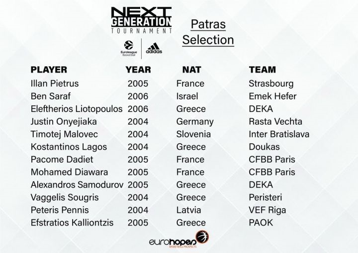 Το Adidas Next Generation Tournament της Πάτρας θα φιλοξενήσει τα “project” του μέλλοντος των Μπαρτσελόνα, Ζάζα Πατσούλια Τιφλίδας, Μακάμπι Τελ Αβίβ, αλλά και των Ακαδημία Ελσίνκι και Στέλα Aτζούρα Ρώμης, πέραν βεβαίως της team Σπανούλη, Next Generation Patras.