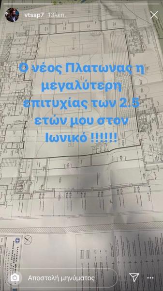 Χαρακτηριστικό της ικανοποίησης που νιώθει ο ισχυρός άνδρας της ομάδας της Νίκαιας, η οποία θυμίζουμε πως αγωνίζεται στο «Σοφία Μπεφόν», είναι το γεγονός πως έγραψε στα social media: «Ο νέος Πλάτωνας η μεγαλύτερη επιτυχία των 2,5 ετών μου στον Ιωνικό».