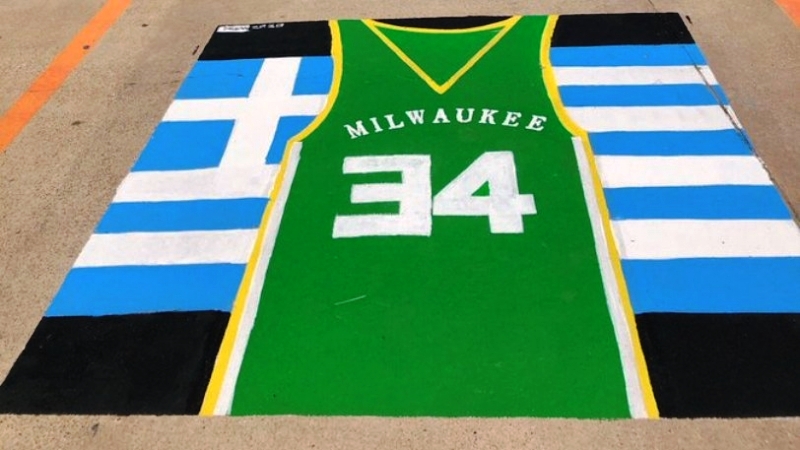Αυτή τη φορά, ένας λάτρης του Greek Freak ζωγράφισε σε πάρκινγκ την ελληνική σημαία μαζί με τη φανέλα του στους Μιλγουόκι Μπακς.